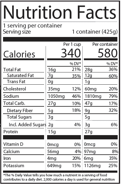Water, Angus Beef, Beans, Green Chili Peppers, Onions, Green Bell Peppers, Red Bell Peppers, Tomato Paste, Corn Flour, Salt, Chili Powder, Cornstarch, Sugar, Garlic Powder, Citric Acid, Dehydrated Jalapeño Peppers, Red Pepper.